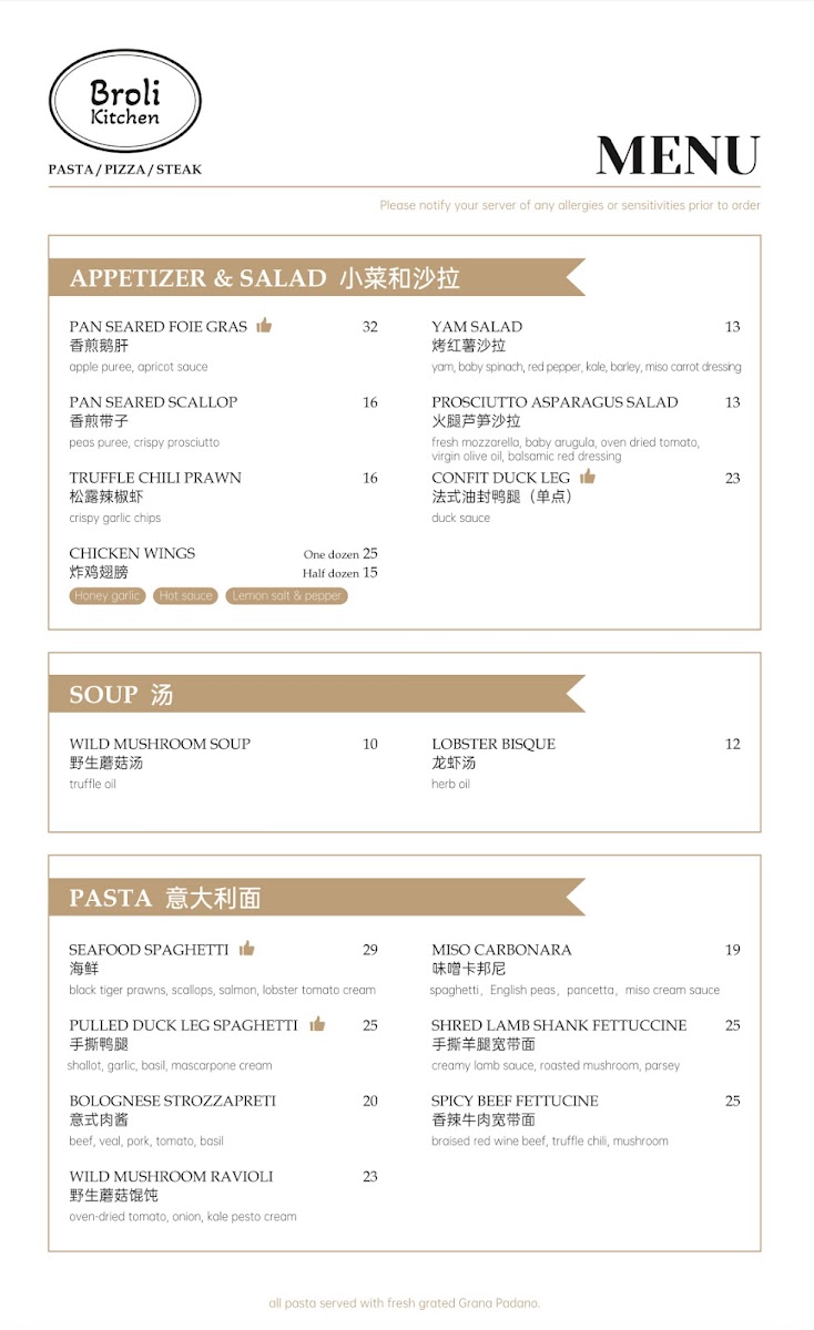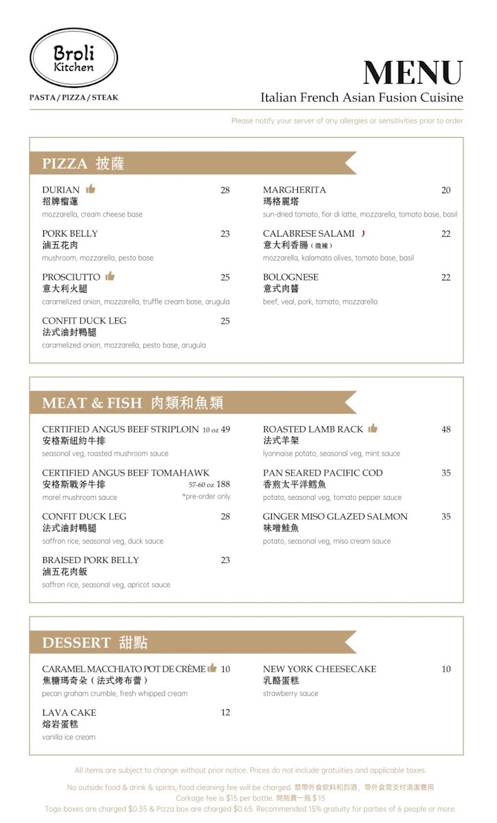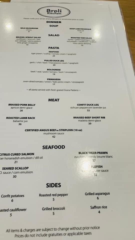 Introducing Broli Kitchen, a remarkable fusion restaurant nestled in Richmond, BC, specializing in a delicious blend of Italian and Asian cuisines. The menu features enticing offerings, starting with velvety Wild Mushroom Soup drizzled with truffle oil and rich Lobster Bisque topped with herb oil. For mains, indulge in the succulent Certified Angus Beef Striploin or the adventurous Durian Pizza, merging sweet and savory flavors on a chewy crust. Notable dishes like the Roasted Lamb Rack and Pork Belly Pizza have earned rave reviews for their bold taste and generous portions. Elevate your meal with exquisite desserts such as the Caramel Macchiato Pot De Creme and indulgent Lava Cake, both crafted in-house. Broli Kitchen not only delights the palate but also offers a warm atmosphere and friendly service, making it a must-visit destination for both locals and tourists alike!